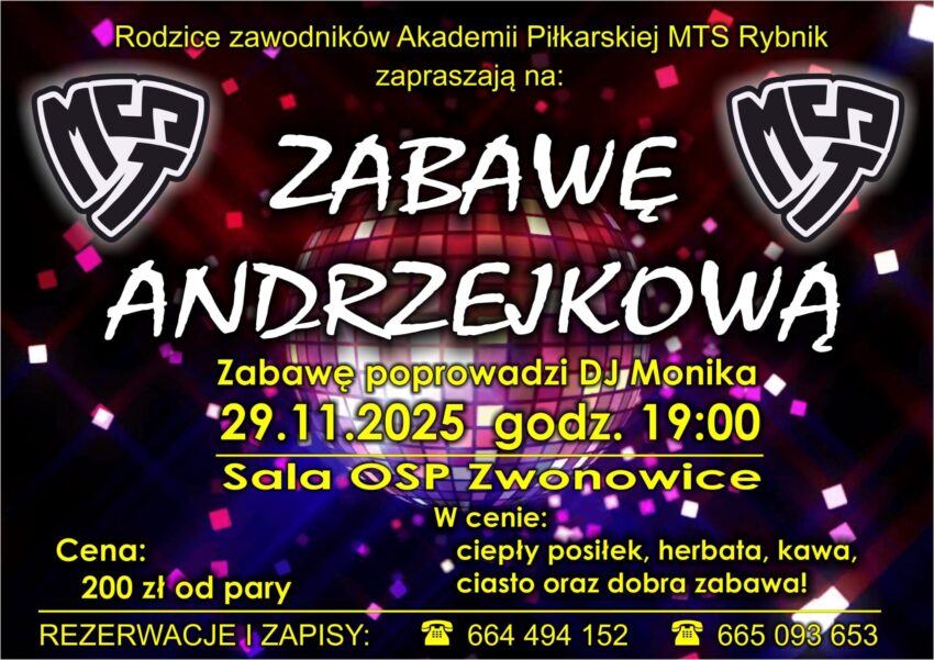 Koniec listopada to czas wróżb, świetnej zabawy i spotkań w wyjątkowej atmosferze. Właśnie dlatego Rodzice zawodników Akademii Piłkarskiej MTS Rybnik zapraszają wszystkich sympatyków klubu, przyjaciół oraz osoby spragnione dobrej imprezy na Zabawę Andrzejkową 2025!